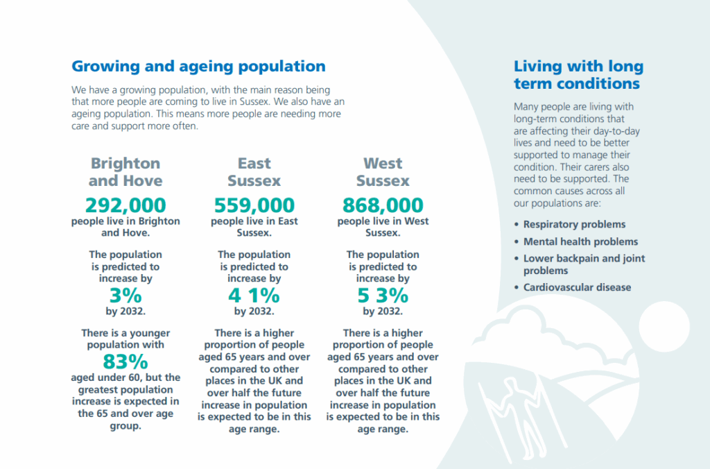 The Sussex ICS footprint is large, bounded by the English Channel and coastal towns to the south, it contains a city (Brighton & Hove), one New Town (Crawley) and a rural hinterland with market towns, smaller towns, and villages. 1.718m people live in Sussex (2020): 292k in Brighton and Hove; 559k in East Sussex and 868k in West Sussex.