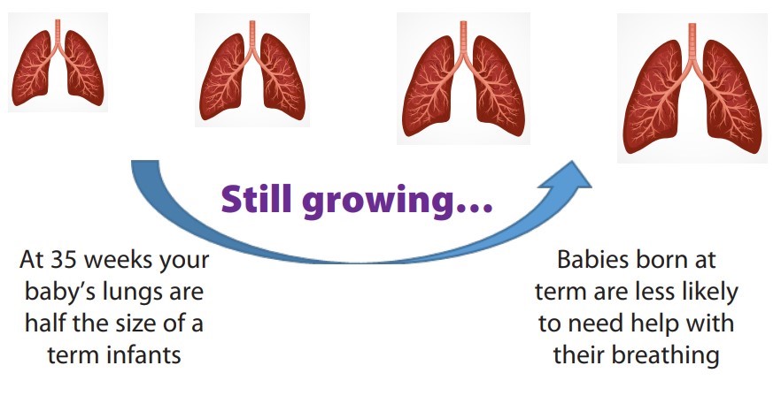 Your baby’s lungs keep growing and getting ready to breathe until your baby is born. If your baby is born early their lungs may not be fully developed. This can mean that your baby gets tired easily and that the effort of breathing causes them some distress.