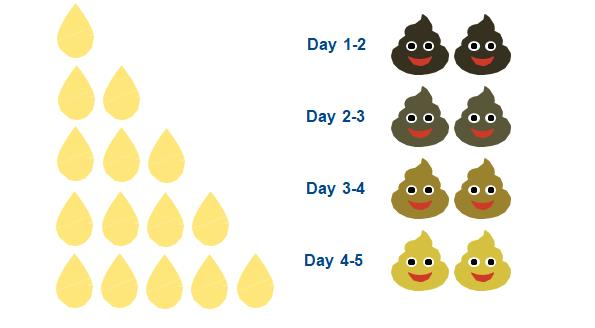 - dirty nappies: At least 1, ‘tar-like’ poo, called meconium in the first 24 hours, becoming less sticky and starting to change to brown/green by day 2.
