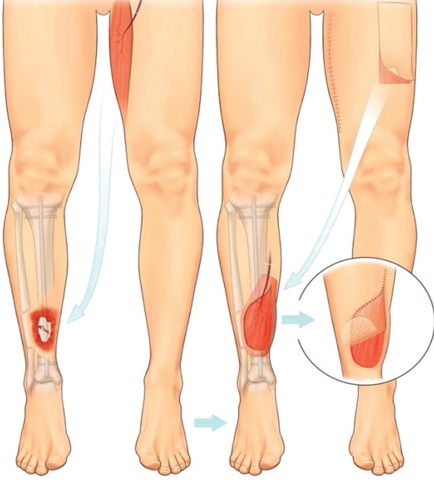 A block of tissue is taken, along with its blood vessels, from a distant part of your body (the donor site) and placed into the wound. This may be in a composite form, which is skin and fat or muscle, or may be just muscle. The blood vessels are then re-attached to the recipient site using microsurgical techniques and the transplanted tissue lives on its new location. The donor site is either stitched closed or may need to be resurfaced with a skin graft. Muscle flaps without skin also require a skin graft on top.