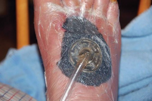 If internal fixation doesn’t work, you will be fixed together externally as a temporary measure (external fixation), and the wound will be covered, usually with a suction dressing (picture below). You will then return to theatre in the next few days for final bone fixation by the orthopaedic surgeon and soft tissue reconstruction by the plastic surgeon in a joint operation.