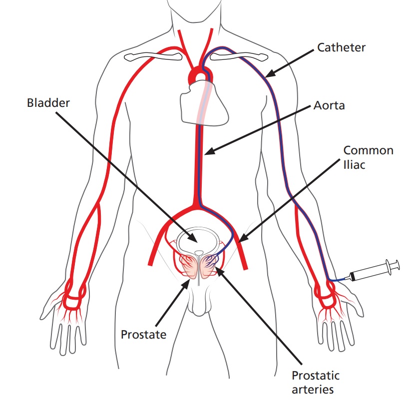 • Once the prostate blood supply has been confirmed, fluid containing thousands of tiny particles is injected through the catheter into the arteries that supply the prostate. This blocks these blood vessels and the prostate is starved of its blood supply.