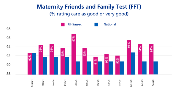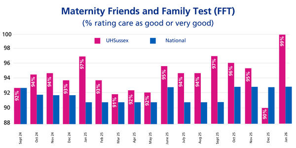 As of March 2025, the national ‘very good’ rate for the Friends and Family Test stands at 92%. UHSussex has consistently exceeded this benchmark over the last four years: