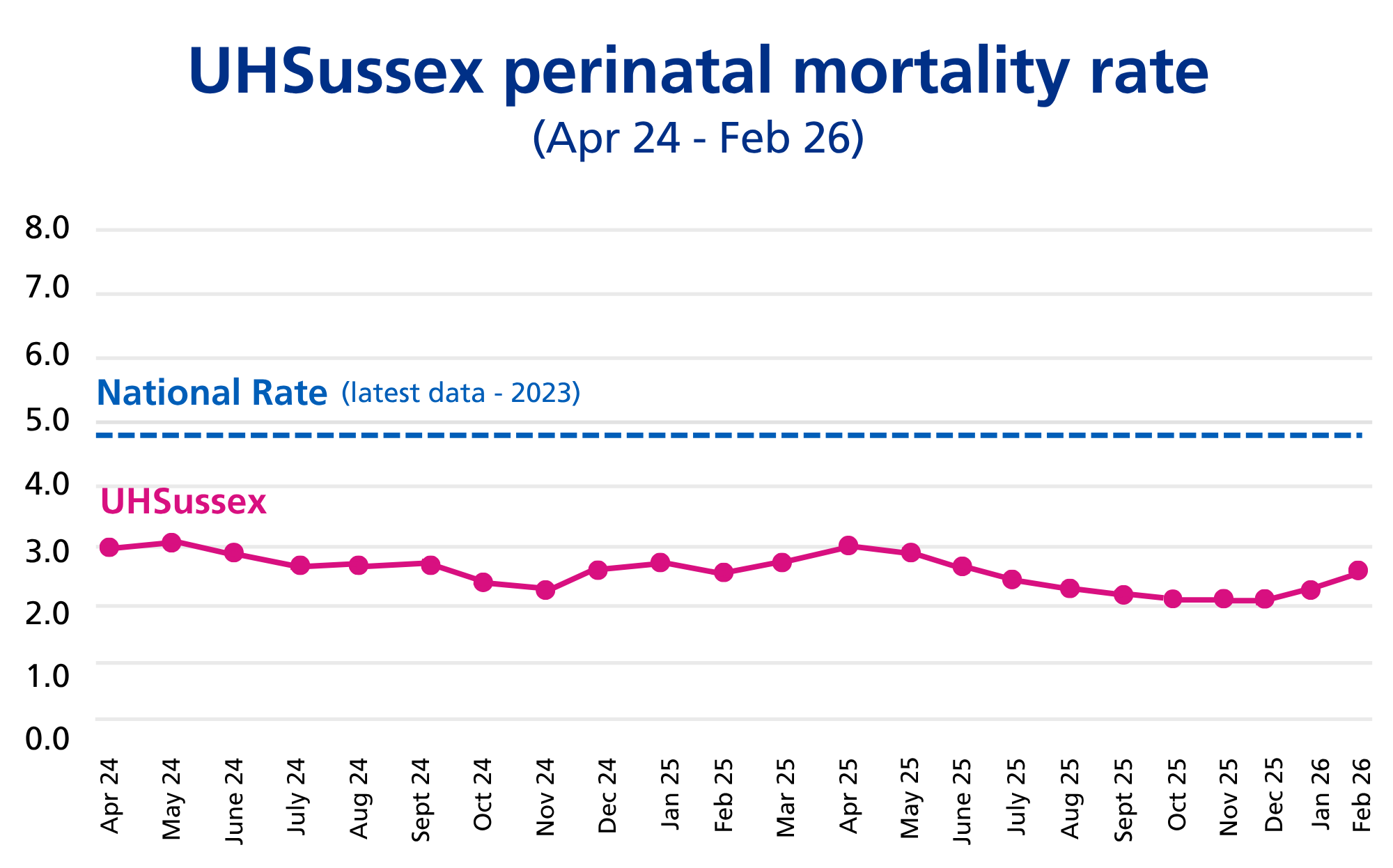Our maternity services have consistently stayed within the expected national range. In fact, thanks to targeted improvements, our rates are now significantly better than the national benchmark.